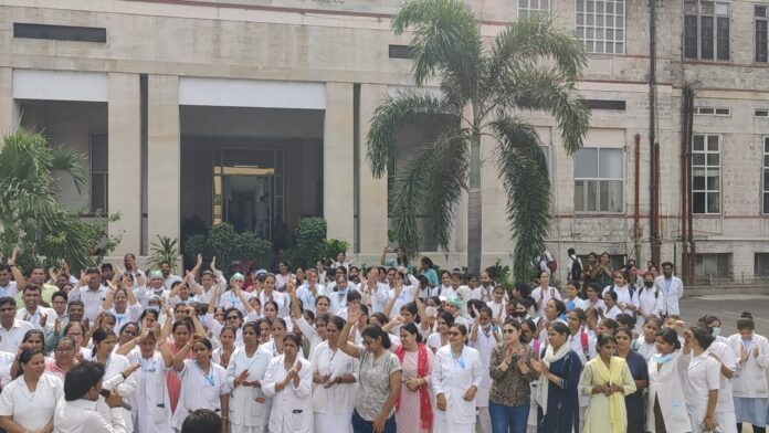 जयपुर | राजस्थान नर्सेज संयुक्त संघर्ष समिति के प्रांतीय आह्वान पर आज 9 वें दिन भी एसएमएस मेडिकल कॉलेज से संलग्न सभी चिकित्सालय में सुबह 8 बजे से 10 बजे तक टोकन स्ट्राइक कर कल अधिक से अधिक संख्या में सभी नर्सेज ने महारैली में सम्मिलित होने की शपथ ली | एसएमएस हॉस्पिटल के गेट पर आज 38 में दिन भी धरना जारी 25 अगस्त को संपूर्ण राजस्थान से हजारों नर्सेज जयपुर में कूच करेंगे और सरकार से 11 सूत्री मांगों के समर्थन में विरोध प्रदर्शन करेंगे |