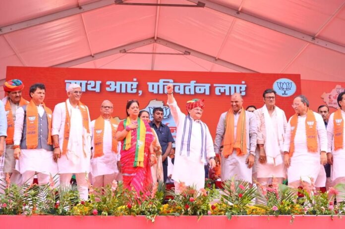 जयपुर, 02 सितंबर 2023। भाजपा की परिवर्तन संकल्प यात्रा का आगाज आज रणथम्भौर के त्रिनेत्र गणेश मंदिर में पूजा अर्चना के साथ हुआ। गणेश मंदिर में पूजा के बाद दशहरा मैदान में आयोजित जनसभा के दौरान भाजपा के राष्ट्रीय अध्यक्ष जेपी नड्डा, पूर्व मुख्यमंत्री वसुंधरा राजे, चुनाव प्रभारी प्रहलाद जोशी, प्रदेश प्रभारी अरुण सिंह, भाजपा प्रदेशाध्यक्ष सीपी जोशी, नेता प्रतिपक्ष राजेन्द्र राठौड़, उपनेता प्रतिपक्ष सतीश पूनिया,के साथ अन्य वरिष्ठ नेताओं ने परिवर्तन संकल्प यात्रा के स्टीकर का विमोचन किया। इसके बाद भाजपा के वरिष्ठ नेताओं ने जनसभा को संबोधित किया, उसके बाद परिवर्तन संकल्प यात्रा के रथ को हरी झंडी दिखाकर रवाना किया गया।