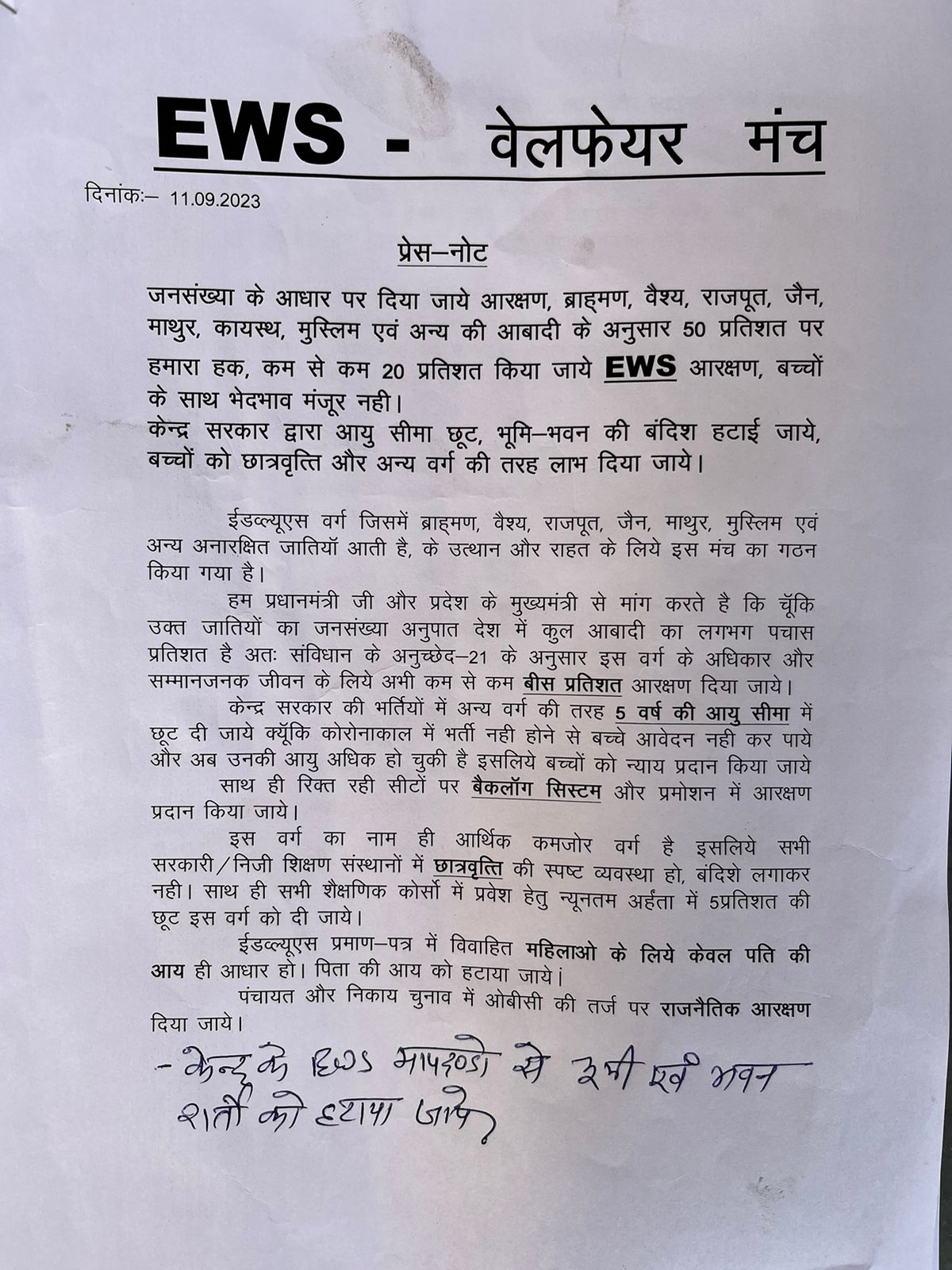 राजकोष में हमारा सबसे ज्यादा योगदान इसलिए हमारे बच्चों को भी छात्रवृत्ति अन्य वर्गो की तरह दी जाये। EWS वर्ग जिसमें ब्राह्मण, वैश्य, राजपूत, जैन, माथुर, मुस्लिम एवं अन्य अनारक्षित जातियों आती है उसी के उत्थान और राहत के लिये इस मंच का गठन किया गया है।