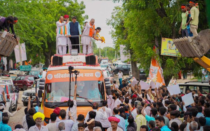 अजमेर, 14 सितम्बर। बीजेपी की परिवर्तन संकल्प यात्रा का आज गुरूवार को केकड़ी, नसीराबाद, किशनगढ़ व अजमेर विधानसभा क्षेत्र में जोरदार स्वागत हुआ, यात्रा में भाजपा प्रदेशाध्यक्ष सीपी जोशी, महाराष्ट्र के उप मुख्यमंत्री देवेन्द्र फडणवीस, प्रदेश सह प्रभारी विजय राहटकर और अजमेर सांसद भागीरथ चौधरी सहित अन्य भाजपा पदाधिकारी मौजूद रहे। इस अवसर पर सीपी जोशी ने गहलोत सरकार तीखे प्रहार करते हुए कहा कि राजस्थान में कांग्रेस की ऐसी नाकारा निकम्मी और महाभ्रष्ट सरकार बैठी है जिसने भ्रष्टाचार अब तक के सारे रिकॉर्ड तोड दिए। जनता के खून पसीने की कमाई से जन कल्याण के काम होने चाहिए लेकिन सारे भ्रष्टाचारी अपनी जेबें भरने में लगे हुए है, कहीं से सोना निकल रहा है तो कहीं से नोटों की गड्डियां।