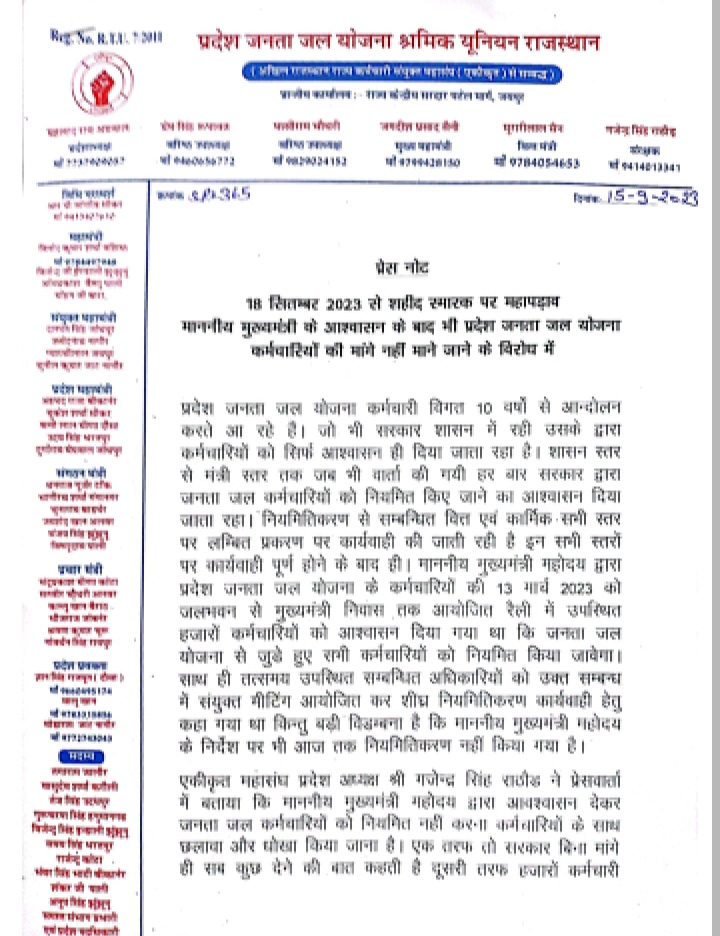 जयपुर | प्रदेश जनता जल योजना कर्मचारी विगत 10 वर्षों से आंदोलन करते आ रहे हैं जो भी सरकार शासन में रही उसके द्वारा कर्मचारियों को सिर्फ आश्वासन ही दिया जाता रहा है शासन स्तर से मंत्री स्तर तक जब भी वार्ता की गई हर बार सरकार द्वारा जनता जल कर्मचारियों को नियमित कार्य किए जाने का आश्वासन दिया जाता रहा नियमितकरण से संबंधित वित्त एवं कार्मिक सभी स्तर पर लंबित प्रकरण पर कार्रवाई की जाती रही है इन सभी स्तरों पर कार्रवाई पूर्ण होने के बाद ही माननीय मुख्यमंत्री महोदय द्वारा प्रदेश जनता जल योजना के कर्मचारियों की 13 मार्च 2023 को जल भवन से मुख्यमंत्री निवास तक आयोजित रैली में उपस्थित हजारों कर्मचारियों को आश्वासन दिया गया था कि जनता जल योजना से जुड़े हुए सभी कर्मचारियों को नियमित किया जाएगा | मुख्यमंत्री महोदय के निर्देश पर आज तक नियमितीकरण नहीं किया गया है एकीकृत महासंघ प्रदेश अध्यक्ष गजेंद्र सिंह राठौड़ ने प्रेस वार्ता में बताया कि माननीय मुख्यमंत्री महोदय द्वारा आश्वासन देकर जनता जल कर्मचारियों को नियमित नहीं करना कर्मचारियों के साथ छलावा और धोखा किया जाना है एक तरफ तो सरकार बिना मांगे ही सब कुछ देने की बात कहती है दूसरी तरफ हजारों कर्मचारी मुख्यमंत्री के आश्वासन के बाद भी नियमित होने की बाट जो रहे हैं प्रेस वार्ता के दौरान प्रदेश जनता दल श्रमिक यूनियन प्रदेश अध्यक्ष प्रहलाद राय अग्रवाल , घासीराम संगठन मंत्री , बत्ती लाल, विष्णु पाली, विजेंद्र सिंह, अनूप, धनराज, शालू खान, प्रेम सिंह रूपावत, दलपत सिंह, श्रवण सिंह, सुरेश, उदय सिंह, वासुदेव, भागीरथ, राजपाल, तगाराम, दुर्गारामआदि पर्त्रकार वार्ता में उपस्थित सभी पदाधिकारी ने सरकार पर वादा खिलाफी का आरोप लगाते हुए जनता जल योजना कर्मचारियों को शीघ्र नियमित करने की मांग की गई सभी जिलों से आए पदाधिकारी ने एक ही स्वर में कहा गया कि कर्मचारियों के नियमितीकरण आदेश जारी नहीं होने तक सभी कर्मचारी महापड़ाव में शामिल रहेंगे |