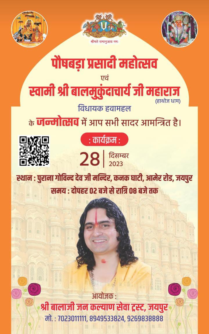 जयपुर। कल दिनांक 28 दिसंबर 2023 को श्री बालाजी जन कल्याण सेवा ट्रस्ट के द्वारा पौषबड़ा प्रसादी विधायक स्वामी बालमुकुंदाचार्य के जन्मोत्सव पर पौषबड़ा प्रसादी महोत्सव का आयोजन किया जा रहा है आयोजन हर वर्ष की भांति इस बार स्थान पुराना गोविंद देव जी मंदिर कनक घाटी आमेर रोड जयपुर समय दोपहर 2:00 बजे से रात्रि 8:00 बजे तक होगी।