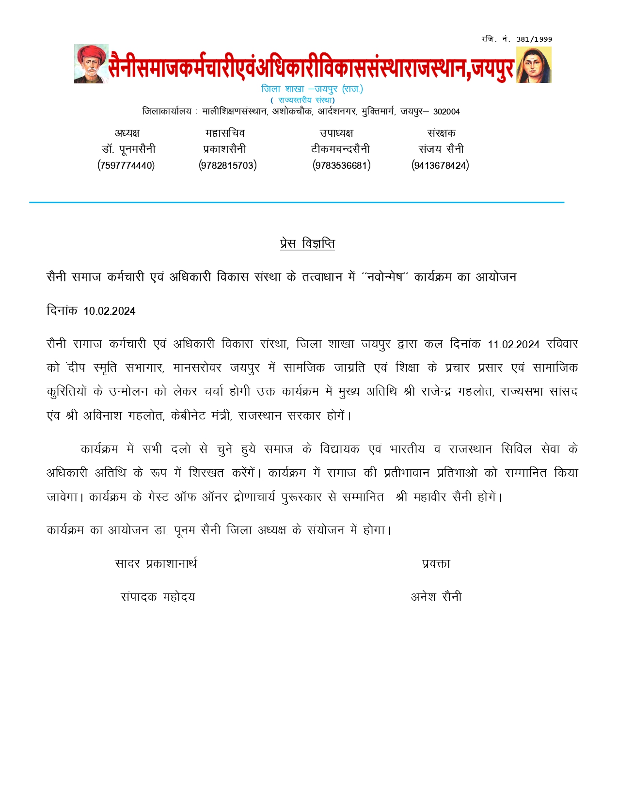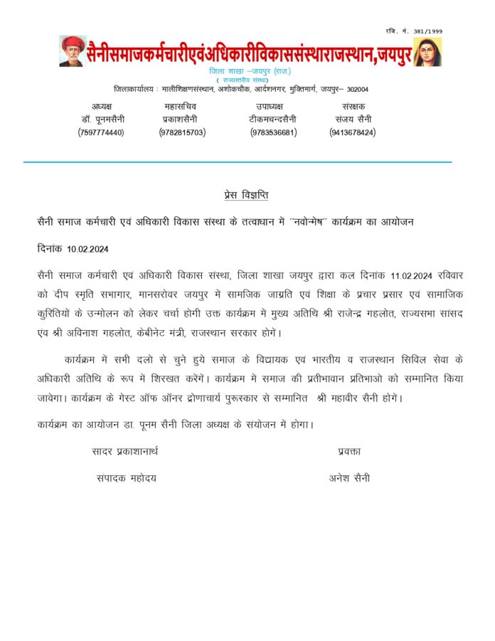 जयपुर | सैनी समाज कर्मचारी एवं अधिकारी विकास संस्था जिला शाखा जयपुर द्वारा कल दिनांक 11-02-2024 रविवार को दीप स्मृति सभागार मानसरोवर जयपुर में सामाजिक जागृति एवं शिक्षा के प्रचार प्रसार एवं सामाजिक कुरीतियों के उन्मूलन को लेकर चर्चा होगी | कार्यक्रम में मुख्य अतिथि राजेन्द्र गहलोत राज्यसभा सांसद एवं अविनाश गहलोत कैबिनेट मंत्री राजस्थान सरकार होगें। कार्यक्रम में सभी दलों से चुने हुए समाज के विधायक एवं भारतीय व राजस्थान सिविल सेवा के अधिकारी अतिथि के रूप में शिरकत करेंगें। कार्यक्रम में समाज की प्रतिभावान प्रतिभाओं को सम्मानित किया जावेगा। कार्यक्रम के गेस्ट ऑफ ऑनर द्रोणाचार्य पुरस्कार से सम्मानित महावीर सैनी होगें। कार्यक्रम का आयोजन डा पूनम सैनी जिला अध्यक्ष के मार्ग निर्देशन में होगा।