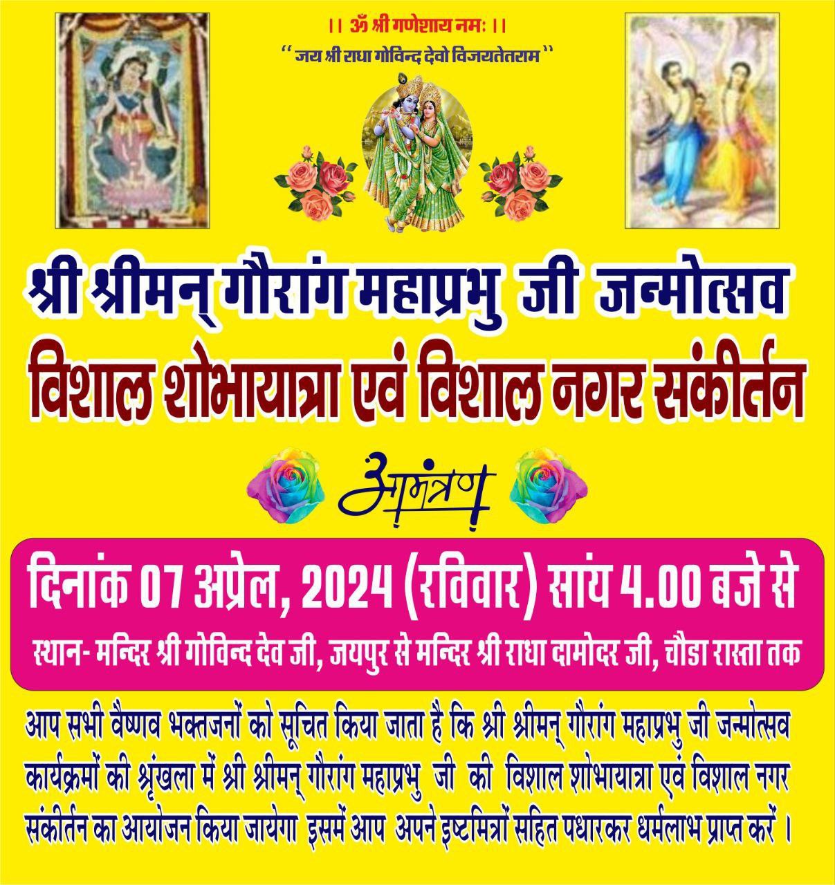 जयपुर , 3 अप्रैल। दिनांक 7 अप्रैल 2024 को श्री चैतन्य महाप्रभु जी के 538 में प्राकट्य महोत्सव के तहत विशाल शोभायात्रा मंदिर श्री गोविंद देव जी से रवाना होकर हवा महल रोड , बड़ी चौपड़ , जोहरी बाजार , गोपाल जी का रास्ता होते हुए मंदिर से दामोदर जी मंदिर चौड़ा रास्ता जी पहुंचेगी। इस विशाल शोभायात्रा में तीन रथ जिसमें श्री महाप्रभुजी मंदिर की झांकी , श्री श्री गौरांग प्रभु जी नित्यानंद महाप्रभु जी की झांकी और षट्भुज महाप्रभु जी की झांकी सजाई जाएगी। इसके साथ ही तीन कीर्तन मंडली अपनी सेवा प्रदान करेगी जिसमें महिला कीर्तन मंडल, बेनाडा संकीर्तन मंडल एवं गोविंद पारिकर कीर्तन मंडल द्वारा हरि नाम संकीर्तन इस पावन शोभायात्रा में सेवा की जाएगी ।शोभा यात्रा सायं 5:00 बजे मंदिर से आरती महंत अंजन कुमार गोस्वामी द्वारा महंत मलय गोस्वामी दामोदर जी मंदिर ,महंत सिद्धार्थ गोस्वामी मंदिर श्री गोपीनाथ जी , अलबेली माधुरी शरण महाराज सरस निकुंज, सियाराम दास महाराज एवं अन्य संत महंतों के सानिध्य में निकली जाएगी। आप सभी गोविंद भक्तों वैष्णव भक्तों से निवेदन है की शोभायात्रा में अधिक से अधिक संख्या में पीले वस्त्र में शामिल होकर धर्म लाभ प्राप्त करें।