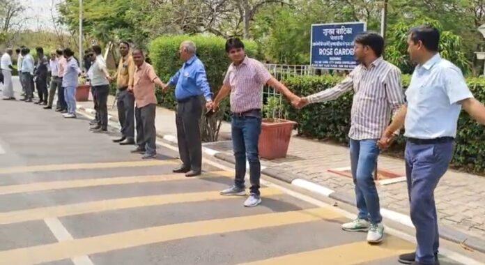 जयपुर, 10 अप्रैल | आज दिनांक 10/04/2024 को मालवीय राष्ट्रीय प्रौद्योगिकी संस्थान (MNIT) में व्याप्त प्रशासनिक अनियमितता, तानाशाही रवैये तथा कर्मचारियों की जायज लंबित मांगों के आदेश जारी नहीं करने के विरोध में अशैक्षणिक कर्मचारी संघ (NTSA) के समस्त सदस्यों द्वारा दिनांक 01/04/2024 से जारी विरोध प्रदर्शन आज भी किया गया। संघ के अनुसार भ्रष्टाचार में लिप्त संस्थान के निदेशक के आवास का आज दोपहर चिलचिलाती धुप में समस्त कर्मचारियों द्वारा विरोध स्वरूप मानव श्रृंखला बना कर घेराव किया और रैली निकाली। ताकि पिछले 10 दिनों से संस्थान से भागे हुए निदेशक एवं कुलसचिव तक कर्मचारियों की पीड़ा का अहसास करवाया जा सके। किन्तु हठधर्मी निदेशक एवं कुलसचिव के कानों में जूं तक नहीं रेंगी।