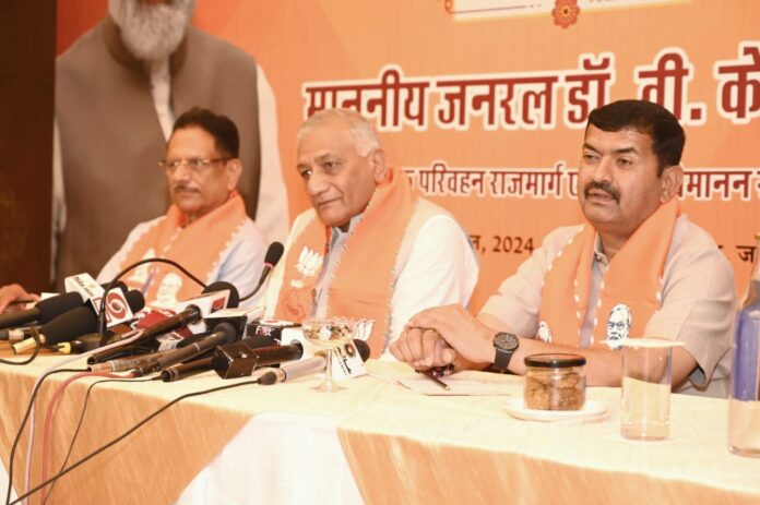 जयपुर, 13 अप्रैल । केंद्रीय सड़क परिवहन राजमार्ग एवं नागर विमानन राज्यमंत्री डाॅ. वी.के. सिंह ने आज जयपुर में प्रेसवार्ता को संबोधित करते हुए बताया कि पिछले 10 वर्षो में प्रधानमंत्री नरेंद्र मोदी के भारत विश्व में अपना एक अलग मुकाम हासिल किया है उन्होंने मोदी कार्यकाल की उपलब्धियां गिनाते हुए कहा कि सड़क परिवहन, एविएशन, इंफ्रास्ट्रक्चर, सौर ऊर्जा के क्षेत्र में आत्मनिर्भरता, ग्रीन एनर्जी , हाइड्रो एनर्जी के साथ रेलवे का विद्युतीकरण और महिला सशक्तिकरण के क्षेत्र में हुए आमूल-चूल परिवर्तन हुआ। राज्यमंत्री ने कहा कि भारत में 2014 में राष्ट्रीय राजमार्गों की लंबाई जहां 90 हजार किलोमीटर थी, वहीं मोदी सरकार बनने के बाद राष्ट्रीय राजमार्गों की लंबाई बढ़कर 1 लाख 60 हजार किलोमीटर तक पहुंच गई। देश में 2014 तक 74 हवाई अड्डे हुआ करते थे, वहीं प्रधानमंत्री नरेंद्र मोदी के नेतृत्व में इनकी संख्या 148 हो गई। इतना ही नहीं, कई हवाई अड्डों का काम निर्माणाधीन है जिसके बाद देशभर में हवाई अड्डों की संख्या बढ़कर 200 हो जाएगी।