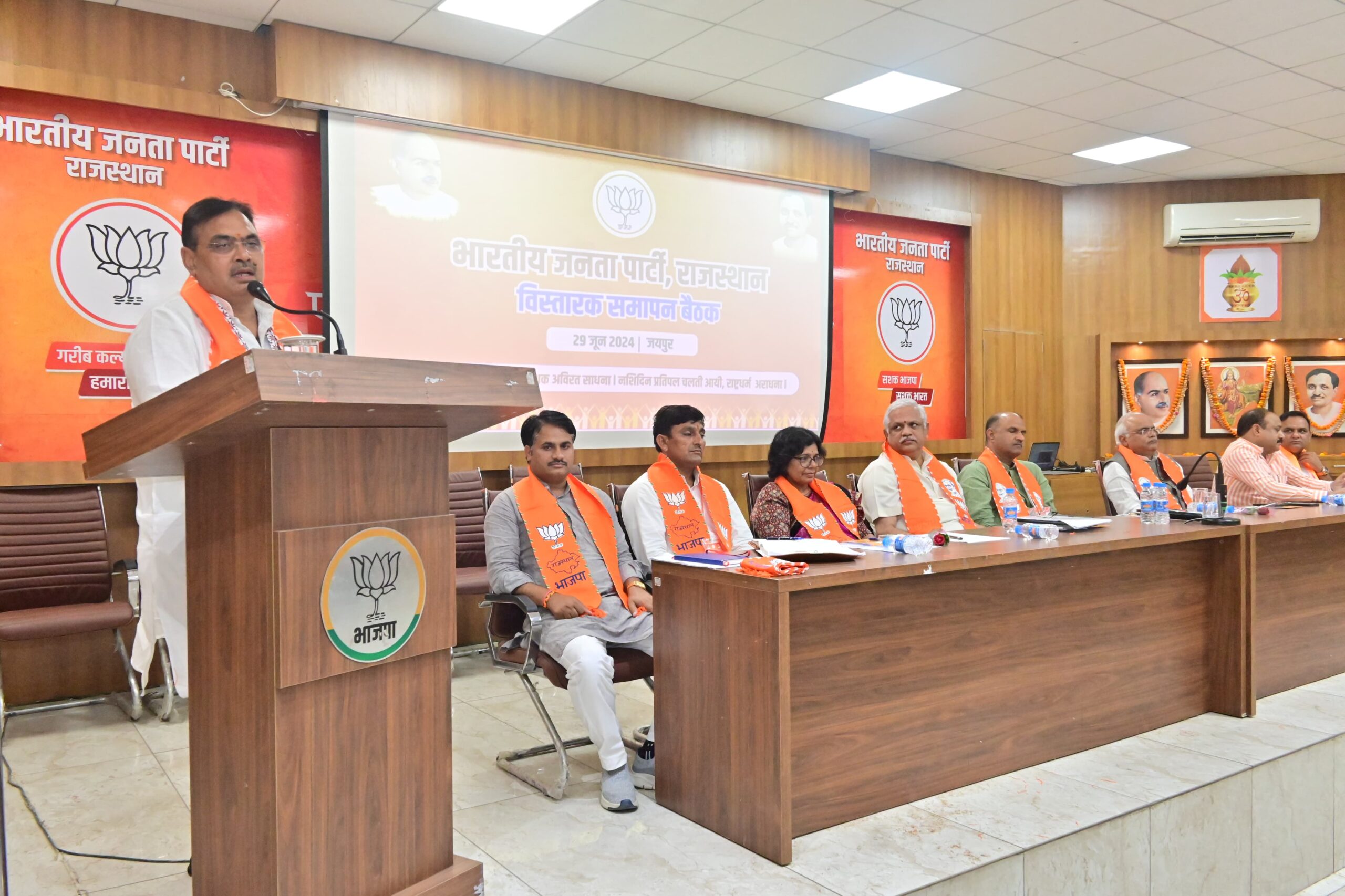 मुख्यमंत्री भजनलाल शर्मा ने संबोधित करते हुए कहा कि पार्टी में काम करते है तो काम होने के साथ ही व्यक्ति की पहचान भी बनती है। विस्तारकों ने क्षेत्र में काम करते हुए पार्टी को समय दिया, इससे पार्टी का कार्य होने के साथ ही विस्तारकों की नई पहचान भी बनी है। प्रत्येक विस्तारक ने पूर्ण रूप से मन और भाव से काम किया। इससे पार्टी एवं संगठन जमीनी स्तर पर भी मजबूत हुआ है। भाजपा का कार्य राष्ट्र का कार्य, और भाजपा ही ऐसी पार्टी है जहां राष्ट्र को प्रथम मानकर कार्य किया जाता है। बैठक में भाजपा चुनाव प्रभारी विनय सहस्त्रबुद्धे ने भी विस्तारकों से चर्चा की और विस्तारकों के अनुभवों को लेखबद्ध करने की अपील की।