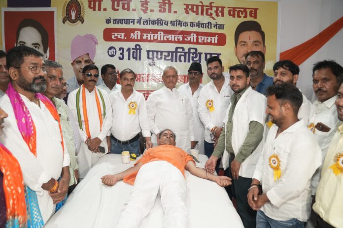 जयपुर 2 अगस्त | आज जलदाय विभाग के जलदाय कर्मचारी एवं खिलाड़ियों सहित समाज सेवको ने रक्तदान किया ये शिविर जवाहर नगर के जनउपयोगी भवन में आयोजित हुआ | यह शिविर जलदाय विभाग के कर्मचारी नेता स्व श्री मांगीलाल शर्मा जी की 31 वी पुण्यतिथि पर आयोजित हुआ शिविर में 156 यूनिट रक्तदान हुआ यह आयोजन पीएचईडी स्पोर्ट्स क्लब सहित जलदाय कर्मचारी संघ के तत्वाधान में हुआ । आयोजककर्ता जलदाय कर्मचारी संघ के प्रदेशाध्यक्ष संजय सिंह शेखावत जिला अध्यक्ष ताराचंद सैनी कार्यवाहक प्रदेश अध्यक्ष केदार शर्मा महामंत्री राजेन्द्र सिंह सोलंकी उपाध्यक्ष रघुवीर सिंह ने बताया कि हमारे लोकप्रिय कर्मचारी नेता रहे स्वर्गीय श्री मांगीलाल जी शर्मा की पुण्यतिथि पर हर वर्ष की भांति इस वर्ष भी विशाल रक्तदान शिविर एवं श्रद्धांजलि सभा का आयोजन किया गया जिसमें प्रदेश के समस्त जलदाय कर्मचारी ने भारी संख्या में भाग लिया और उनकी याद में रक्तदान कर श्रद्धांजलि दी |