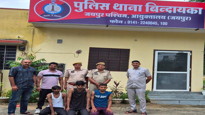 जयपुर, 12सितम्बर | बिंदायका थाना पुलिस ने तीन नकबजन व एक शातिर चोर को गिरफ्तार कर उनके कब्जे से चोरी का माल के साथ उपयोग में ली गई स्कूटी चोरी की मोटरसाइकिल बरामद की गयी | पुलिस उपायुक्त पश्चिम अमित कुमार ने बताया कि सुयशजा जोसफ निवासी कनक वृंदावन मंगलम टाउनशिप ने बिंदायका पुलिस थाने में वह अपने मित्र को मकान की चाबी दे कर माता का इलाज कराने के लिए चेन्नई चले गये | जब मेरे मित्र 13 अगस्त लगभग 12 बजे दोपहर हमारे कुत्ते और चिड़िया को खाना दे कर ताला लगा कर चला गया | जब दूसरे दिन 14 अगस्त को दोपहर में आया तो मेरे घर आया तो उसने पाया कि घर के सारे गेट खुले थे घर का सामान बिखरा हुआ पाया तो उसने तुरंत मुझे सूचित किया साथ ही 100 नम्बर शिकायत दर्ज कराई | जब हम घर वापस आ कर चैक किया तो घर से एक डायमण्ड सेट, चार सोने के कड़े, चार सोने की अंगूठी ( बड़ी ), दो सोने की अंगूठी ( छोटी ), चार सोने की बालिया, चार चांदी घडी गायब है |