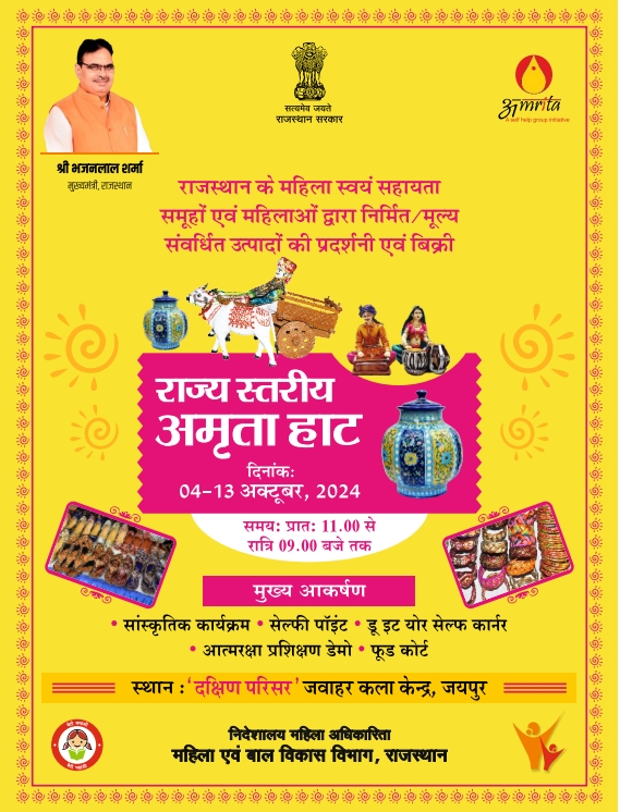 जयपुर, 01 अक्टूबर। महिला अधिकारिता महिला एवं बाल विकास विभाग द्वारा जयपुर के जवाहर कला केन्द्र में राज्य स्तरीय अमृता हाट का आयोजन आगामी 04 अक्टूबर से 13 अक्टूबर तक प्रतिदिन सुबह 11 बजे से रात्रि 9 बजे तक किया जाएगा। उपनिदेशक, महिला अधिकारिता विभाग डॉ. राजेश डोगीवाल ने बताया कि राज्य स्तरीय अमृता हाट का उद्घाटन शुक्रवार, 04 अक्टूबर 2024 को सांय 6 बजे उपमुख्यमंत्री दिया कुमारी करेंगी। कार्यक्रम में महिला एवं बाल विकास विभाग की राज्य मंत्री डॉ. मंजू बाघमार राज्य मंत्री बतौर विशिष्ट अतिथि शिरकत करेंगीं। उन्होंने बताया कि राजस्थान के महिला स्वयं सहायता समूहों एवं महिलाओं द्वारा निर्मित/मूल्य संवर्धित उत्पादों की अमृता हाट में प्रदर्शनी एवं बिक्री की जाएगी। सांस्कृतिक कार्यक्रम, सेल्फी पॉइंट, डू इट योर सेल्फ कार्नर, आत्मरक्षा प्रशिक्षण डेमो, फूड कोर्ट आदि इस राज्य स्तरीय अमृता हाट के आकर्षण के मुख्य केन्द्र होंगे।