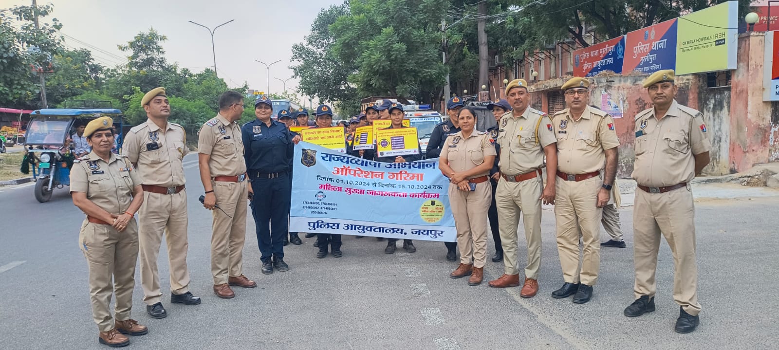 जयपुर, 8 अक्टूबर । महिलाओं- बालिकाओं के साथ होने वाली छेड़छाड़, छींटाकशी आदि की घटनाओं की प्रभावी रोकथाम के लिए पुलिस मुख्यालय राजस्थान जयपुर द्वारा चलाये जा रहे जन जागरूकता अभियान ऑपरेशन गरिमा के विषय में पुलिस कमिश्नर बीजू जॉर्ज जोसफ ने बताया कि अतिरिक्त पुलिस कमिश्नर योगेश दाधीच के निर्देशन में उक्त अभियान के तहत महिलाओं व बालिकाओं की सुरक्षा के लिए आयुक्तालय जयपुर में महिला सुरक्षा जन-जागरूकता के लिये निर्भया स्क्वॉड द्वारा अभियान चलाकर महिलाओं और बालिकाओं से सम्बन्धित पोस्टर, फ्लैक्स बैनर आदि के माध्यम से महिलाओं और बालिकाओं को जागरूक किया गया ।