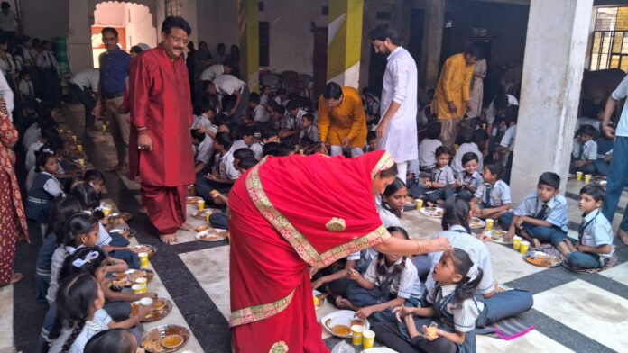 जयपुर 9 अक्टूबर | शारदीय नवरात्रो में जगह जगह नौ देवियों को मनाने के पूजन किया जा रहा है इसी क्रम गलता गेट स्थित मंदिर श्री गीता गायत्री में हर साल की तरह पंडित राजकुमार चतुर्वेदी के सानिध्य में इस साल भी विशाल 1100 से अधिक कन्या बटुकों का कन्या पूजन महोत्सव धूमधाम से किया गया | मंदिर प्रवक्ता नीतीश चैतन्य चतुर्वेदी ने बताया कि माता गीत गायत्री सिद्धिदात्री वैष्णो देवी को अभिषेक उपरांत नूतन नवीन पोशाक धारण कराकर घंटे घड़ियाल को जाकर महाआरती पश्चात पूरी हलवा चैन आलू की सब्जी भुजिया का भोग लगाया गया | साथ ही शक्ति आराधना स्वरूप 1100 कन्याओं बटुकों का पूजन किया गया | उन्हें भेंट चॉकलेट बिस्किट उपहार में दिए गए | इस दौरान कार्यक्रम में नगर निगम हेरिटेज मेयर कुसुम यादव, भाजपा आदर्श नगर प्रत्याशी रवि नैयर, भाजपा नेता सुरेश मिश्रा, डॉक्टर एसपी यादव, रवि जोशी, संदीप तिवारी, नाथू सिंह गुर्जर ने भी निकन्या स्वरूप माता की पूजा अर्चना की।।