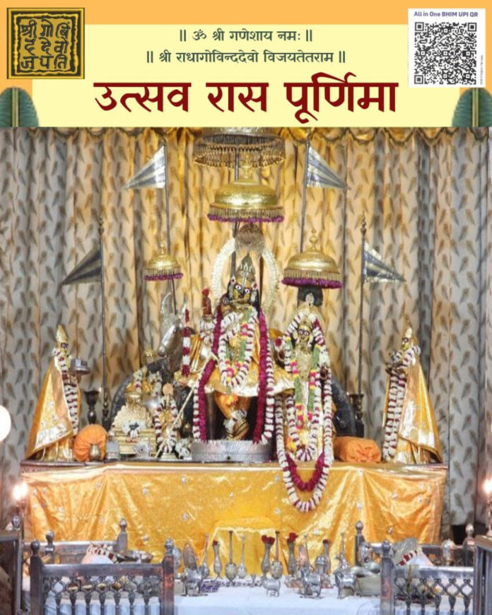 जयपुर, 15 नवम्बर | ठिकाना मंदिर श्री गोविंद देवजी महाराज, जयपुर में उत्सव रास पूर्णिमा आज को मनाई जा रही है । मंदिर सेवाधिकारी मानस गोस्वामी ने बताया कि मंगला झांकी के दर्शन प्रातः 4 बजे से प्रातः 5.30 बजे तक हुए । मंगला झांकी के पश्चात ठाकुर श्री गोविन्द देव जी का वैदिक मंत्रोच्चार के साथ पंचामृत अभिषेक किया गया । आज ठाकुर श्री गोविन्द देव जी को सुनहरे पार्चे की लप्पा जामा पोशाक धारण कराई गयी | साथ ही विशेष फूलों की माला एवं अलंकार श्रृंगार धारण कराया गया । आज के दिन से प्रतिदिन धूप झांकी के अतिरिक्त सभी झांकियों में ठाकुर श्रीजी की कपूर आरती आरम्भ हो जाती है। संध्या झांकी के पश्चात महंत अंजन कुमार गोस्वामी के सानिध्य में विशेष रास पूर्णिमा उत्सव झांकी के दर्शन होंगे जिसका समय रात्रि 7.15 बजे से 7.30 बजे तक रहेगा। इस विशेष झांकी में ठाकुर श्री गोविन्द देव जी के सम्मुख रास का खाट सजाया जाएगा | जिसमें चौसर , शतरंज की झांकी के दर्शन होंगे एवं दूध, पान एवं इत्र की विशेष सेवा अर्पित की जाएगी। आज ठाकुर श्रीजी को खीर एवं मावा लड्डू का विशेष भोग अर्पण किया जाएगा।