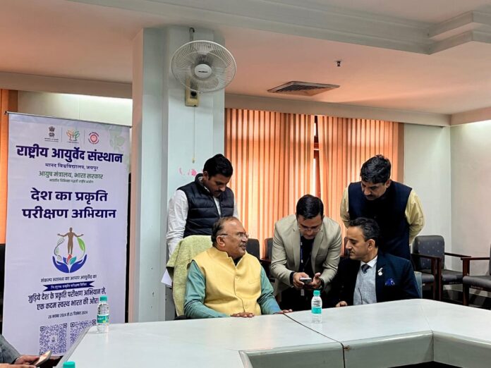 कुलपति प्रो. संजीव शर्मा ने बताया देश का प्रकृति परीक्षण अभियान के अंतर्गत राजस्थान विधानसभा के माननीय सदस्यों, जनप्रतिनिधियों के साथ समेकित बाल विकास सेवा योजना विभाग, महालेखाकार भवन, भारतीय भूवैज्ञानिक सर्वेक्षण के प्रशासनिक सेवा अधिकारियों, कर्मचारियों के साथ केंद्र एवं राज्य सरकार के विभिन्न विभागों और संस्थानों में बड़ी संख्या में प्रकृति परीक्षण किया गया। आयुष मंत्रालय भारत सरकार के पल पर राष्ट्रीय आयुर्वेद संस्थान के चिकित्सक 25 दिसंबर तक अधिक से अधिक लोगों तक उनके बेहतर स्वास्थ्य के लिए प्रकृति परीक्षण करने के लिए कार्यालय, संस्थाओं में पहुंच रहे हैं। संस्थान से डॉक्टर हेतल दवे, डॉक्टर एच एम एल मीणा, डॉक्टर राकेश नागर, डॉक्टर ब्रह्म दत्त शर्मा के साथ आयुर्वेद चिकित्सकों की टीम द्वारा किया गया। उपनिदेशक चंद्रशेखर शर्मा, प्रशासनिक अधिकारी नरेश कुमार गुप्ता, जनसंपर्क अधिकारी विनोद सैन ने अधिक से अधिक लोगों का प्रकृति परीक्षण करवाने ओर अभियान से जोड़ने के लिए विभागों से समन्वय किया।