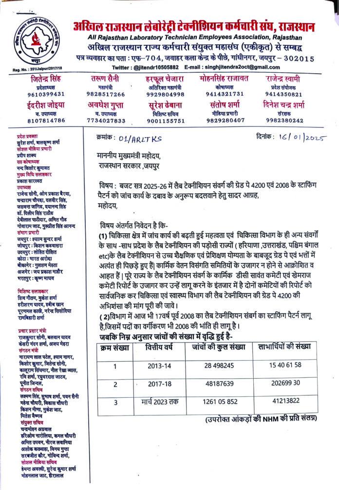 लैब टेक्नीशियन के 17 साल पुराने स्टाफिंग पैटर्न को बदलने की मांग रखी जिसमें जांच और मरीज का भार 10 गुना बड़ा, लेकिन लैब टेक्नीशियन संवर्ग के पदों में वृद्धि नहीं हो पाई है एवं गैर वित्तीय मांग जो कि वित्त विभाग एवं कार्मिक विभाग से अनुमोदित है , के उपरांत लैब टेक्नीशियन के पदनाम परिवर्तन के जल्द नोटिफिकेशन की मांग रखी गई | जिस पर माननीय मुख्यमंत्री भजनलाल शर्मा जी एवं उपमुख्यमंत्री दिया कुमारी ने संवेदनशीलता के साथ सुना जिससे संघ को उम्मीद जगी है इस समस्या का जल्द समाधान हो पाएगा |