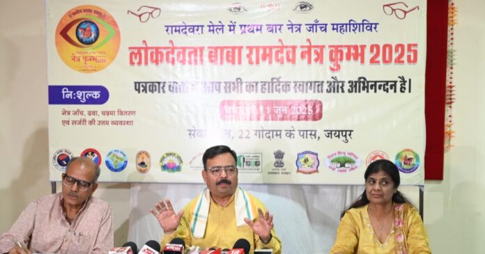 प्रेसवार्ता में सक्षम राजस्थान की सदस्या नेत्ररोग विशेषज्ञ डॉ. मधु गोयल एवं प्रदेशाध्यक्ष डॉ.क्षमाशील गुप्त उपस्थित रहें। सक्षम संस्था जयपुर द्वारा पिछले तीन कुम्भ के मेलों में नेत्रकुम्भ महाशिविर का आयोजन किया गया था, जिसमें 4.86 लाख लोगों की नेत्र जॉच, 3.56 लाख लोगों को चश्मा वितरण एवं 40 हजार लोगों के ऑखों का ऑपरेशन किया गया था। संगठन मंत्री ने इस दौरान बाबा रामदेव समाधी स्थल पर आयोजित होने वाले नेत्रकुम्भ में नेत्र जांच एवं उपचार शिविर व्यवस्थाओं की रूपरेखा से अवगत कराते हुए बताया कि बाबा रामदेव ने 33 वर्ष की उम्र में जीवीत समाधी ली थी, इसलिए रूणीचा, पोकरण में दिनांक 01 अगस्त, 2025 से 02 सितम्ब्र, 2025 तक 33 दिवसीय नेत्र जॉॅच एवं उपचार शिविर का आयोजन किया जाएगा। इसमें सक्षम संस्था जयपुर, राजस्थान सरकार एवं अन्य सहयोगी संस्थाओं का सहयोग रहेगा। लगभग 6 एकड़ भूमि पर सात जर्मन हैंगर बनाये जाएगें। इनमें 50 ओ.पी.डी., चश्माघर, स्वागत पाण्ड़ाल, चिकित्सक एवं अन्य स्टॉफ आवास, भोजन आदि की सम्पूर्ण व्यवस्था रहेगी।
