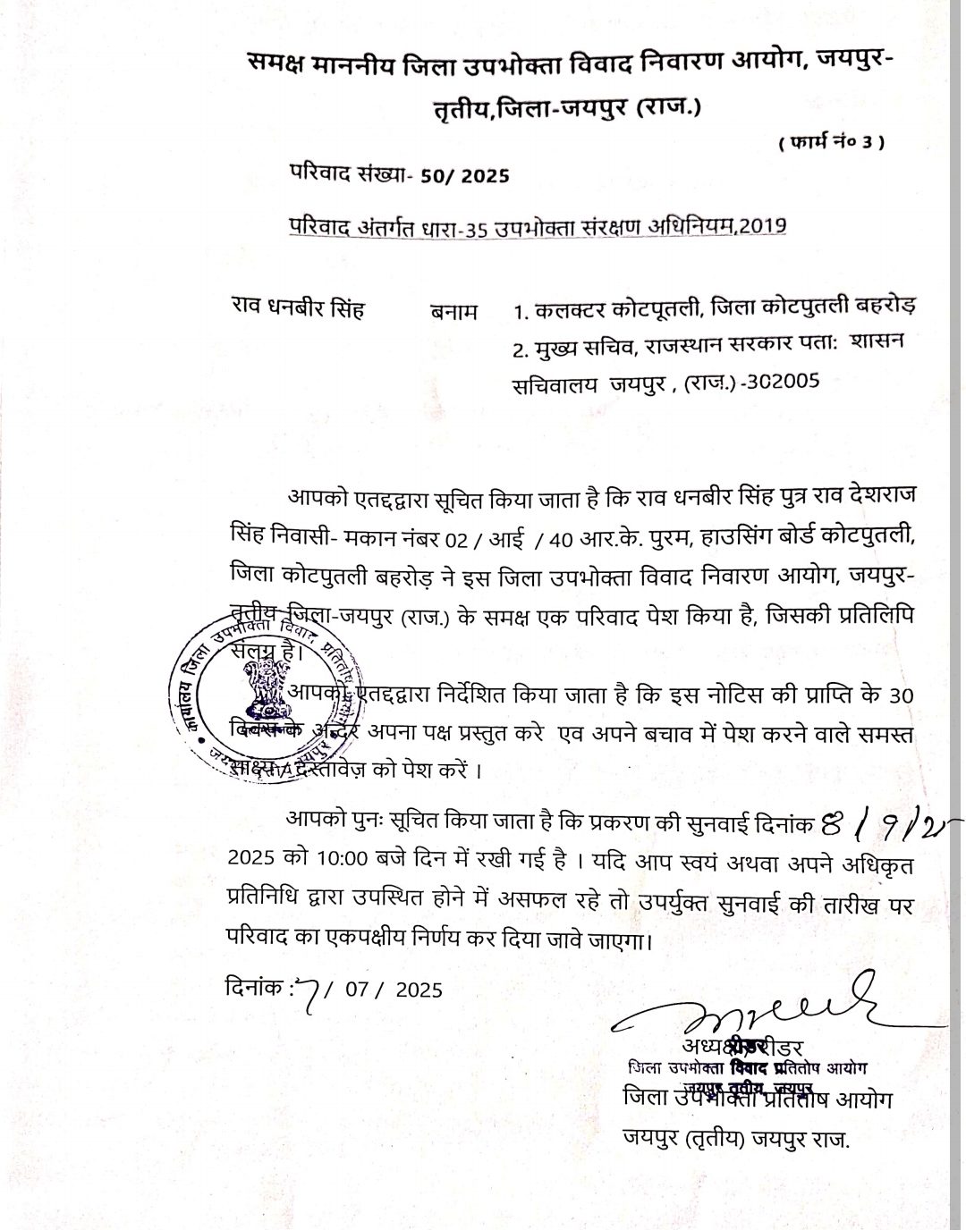 जयपुर, 7 जुलाई। आम नागरिकों के अधिकारों की रक्षा के लिए लगातार सक्रिय रहने वाले लीगल अंबिट संगठन के राष्ट्रीय अध्यक्ष राव धनवीर सिंह ने एक बार फिर प्रशासनिक लापरवाही के खिलाफ बड़ा कदम उठाया है। राव ने भारतीय साक्ष्य अधिनियम के तहत मांगी गई जानकारी तय समय पर न देने पर कलेक्टर कोटपूतली और राजस्थान सरकार के मुख्य शासन सचिव के खिलाफ जिला उपभोक्ता आयोग तृतीय, जयपुर में परिवाद दाखिल किया है।
